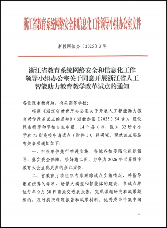 近日,浙江省教育系统网络安全和信息化工作领导小组办公室印发了《关于同意开展浙江省人工智能助力教育教学改革试点的通知》,我校凭借“基于人工智能的个性化学习路径生成”项目获评试点单位,标志着人工智能教育领域的创新实践迈出关键一步。